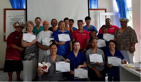 This year we flew directly to Atiu, arriving midday on Friday 30 August. We had a portable ultrasound scanner with us. We ran a clinic on Friday afternoon and again on Monday morning before flying to Aitutaki via Rarotonga. The whole day Tuesday was spent in clinic on Aitutaki. Mrs Tohoa Cummings, the nurse in clinic on Aitutaki, has been involved with the Urogynae HSV since 2011 and as usual had screened the patients and had a full clinic for us. Once back in Rarotonga we set up two clinic rooms. CNS Tina Kusser set up the Urodynamics machine and was able to perform Urodynamic studies while physiotherapist Shelley Solomon and Dr Mairi Wallace saw patients in clinic. The following day, Friday, was spent running a well-attended episiotomy suturing workshop for midwives, doctors and medical students. The following week Dr Wallace was in theatre all week, popping out briefly to see three extra clinic patients.